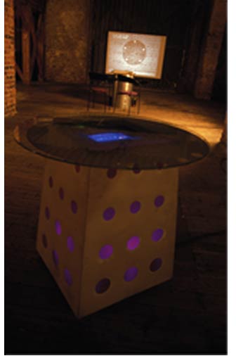 Inside the table there is a computer's CPU and a 15 inches monitor, together with two loud speakers. As an ornamental element I covered the interior walls of the table with coloured paper and placed a lamp inside.