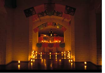 3. Three altars with offerings, as it is done in Mexico: sugar skulls, candles, liqueurs, cigarettes, China paper, Mexican food, fruits and flowers (zempaxochitl or "flor de muerto"). The main altar (see photo) was dedicated to all the Dead ones of the world. The other two altars were dedicated to the two ghosts that are thought to live in the basement of the museum.